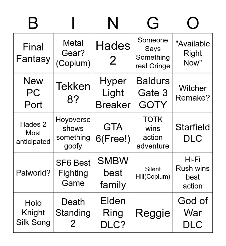 This bingo card has a free space and 24 words: SF6 Best Fighting Game, Death Standing 2, Hyper Light Breaker, Holo Knight Silk Song, "Available Right Now", Final Fantasy, New PC Port, Metal Gear?(Copium), TOTK wins action adventure, SMBW best family, Baldurs Gate 3 GOTY, Hades 2 Most anticipated, Silent Hill(Copium), Hi-Fi Rush wins best action, Tekken 8?, Reggie, Starfield DLC, Hades 2, Witcher Remake?, Hoyoverse shows something goofy, God of War DLC, Palworld?, Someone Says Something real Cringe and Elden Ring DLC?.