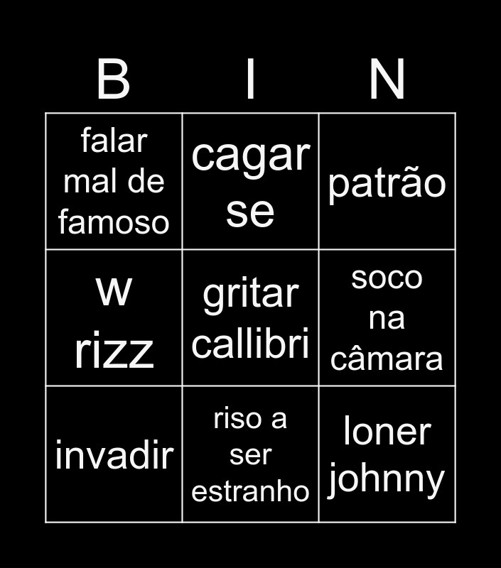 This bingo card has 12 words: atrofiar tvi, loner johnny, gritar callibri, soco na câmara, cagar se, patrão, riso a ser estranho, “polícia”, falar mal de famoso, w rizz, invadir and ser expulso.