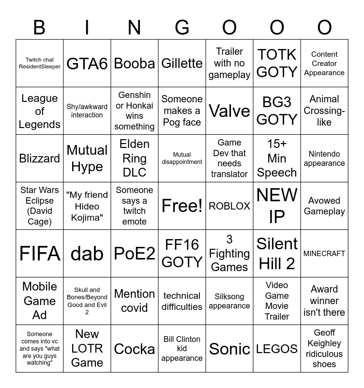 This bingo card has a free space and 48 words: Silksong appearance, BG3 GOTY, Bill Clinton kid appearance, "My friend Hideo Kojima", Elden Ring DLC, Avowed Gameplay, GTA6, New LOTR Game, TOTK GOTY, FF16 GOTY, Content Creator Appearance, Gillette, 15+ Min Speech, Game Dev that needs translator, Mobile Game Ad, NEW IP, League of Legends, Animal Crossing-like, Video Game Movie Trailer, Trailer with no gameplay, Valve, Someone says a twitch emote, Twitch chat ResidentSleeper, Shy/awkward interaction, Award winner isn't there, Genshin or Honkai wins something, Nintendo appearance, Someone comes into vc and says "what are you guys watching", Mutual disappointment, Mutual Hype, LEGOS, ROBLOX, MINECRAFT, Skull and Bones/Beyond Good and Evil 2, Star Wars Eclipse (David Cage), 3 Fighting Games, Silent Hill 2, Blizzard, PoE2, Mention covid, FIFA, Geoff Keighley ridiculous shoes, Booba, Cocka, Someone makes a Pog face, technical difficulties, dab and Sonic.