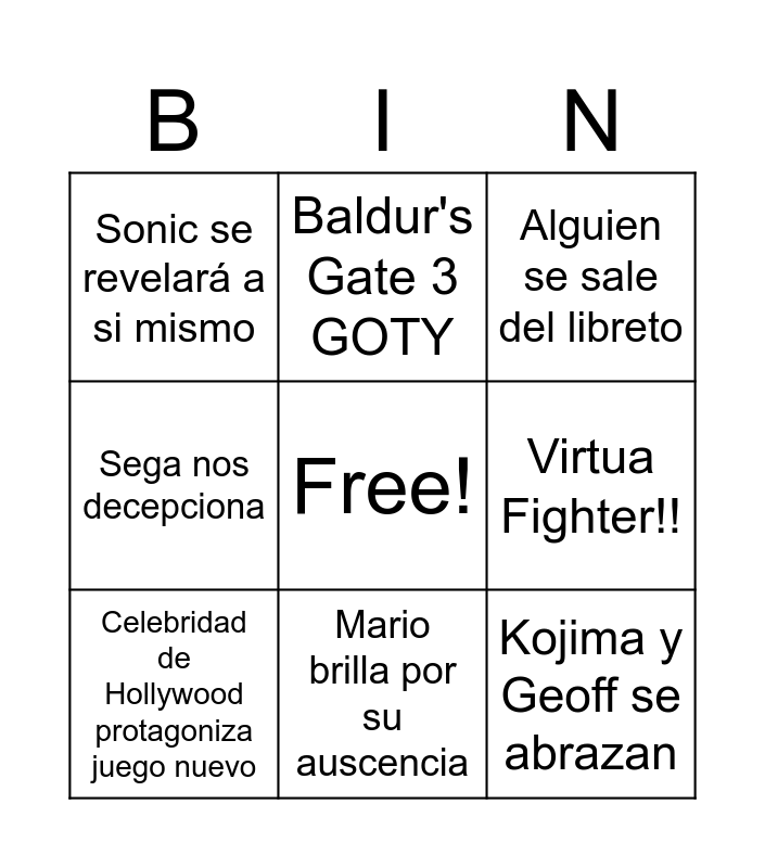 This bingo card has a free space and 8 words: Virtua Fighter!!, Alguien se sale del libreto, Baldur's Gate 3 GOTY, Celebridad de Hollywood protagoniza juego nuevo, Sonic se revelará a si mismo, Kojima y Geoff se abrazan, Sega nos decepciona and Mario brilla por su auscencia.