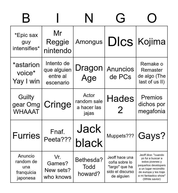 This bingo card has a free space and 24 words: Fnaf. Peeta???, Vr. Games? New sets? who knows, Dragon Age, Anuncio random de una franquicia japonesa, Kojima, *Epic sax guy intensifies*, *astarion voice* Yay I win, Mr Reggie nintendo, Hades 2, Jack black, Anuncios de PCs, Guilty gear Omg WHAAAT, Muppets???, Gays?, Intento de que alguien entre al escenario, Jeoff hace una coña sobre lo "largo" que ha sido el discurso de alguien, Premios dichos por megafonia, Amongus, Remake o Remaster de algo (The last of us II), Cringe, Jeoff dice: "cuando yo fui a buscar a estos jovenes y pequeños developers a un lugar recondito de europa y les traje a mi fantastico show" (White savior), Furries, Dlcs and Bethesda? Todd howard?.