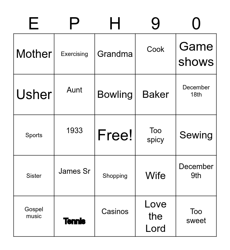 This bingo card has a free space and 24 words: James Sr, Tennis, Bowling, Gospel music, Game shows, Mother, Usher, Exercising, Too spicy, Shopping, Baker, Sports, Wife, December 9th, Aunt, Love the Lord, Sewing, Grandma, December 18th, 1933, Too sweet, Sister, Cook and Casinos.