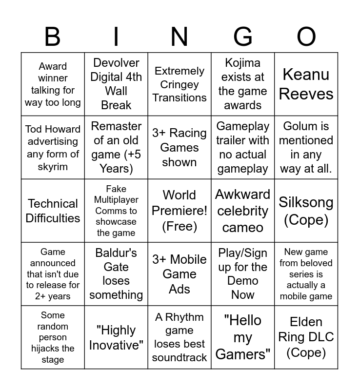 This bingo card has a free space and 24 words: Baldur's Gate loses something, "Highly Inovative", 3+ Racing Games shown, Some random person hijacks the stage, Keanu Reeves, Award winner talking for way too long, Tod Howard advertising any form of skyrim, Devolver Digital 4th Wall Break, Awkward celebrity cameo, 3+ Mobile Game Ads, Gameplay trailer with no actual gameplay, Technical Difficulties, Play/Sign up for the Demo Now, New game from beloved series is actually a mobile game, Remaster of an old game (+5 Years), "Hello my Gamers", Silksong (Cope), Extremely Cringey Transitions, Golum is mentioned in any way at all., Fake Multiplayer Comms to showcase the game, Elden Ring DLC (Cope), Game announced that isn't due to release for 2+ years, Kojima exists at the game awards and A Rhythm game loses best soundtrack.