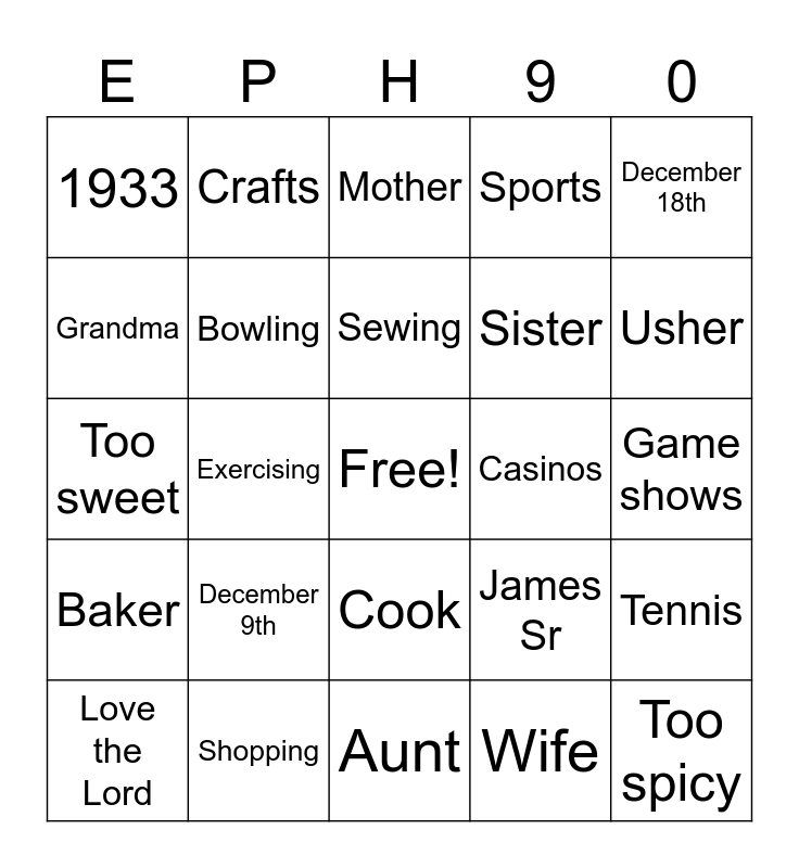 This bingo card has a free space and 25 words: December 9th, Aunt, Sewing, Love the Lord, December 18th, 1933, Grandma, Crafts, Casinos, Cook, Sister, Too sweet, James Sr, Tennis, Bowling, Gospel music, Game shows, Mother, Usher, Exercising, Too spicy, Shopping, Baker, Sports and Wife.
