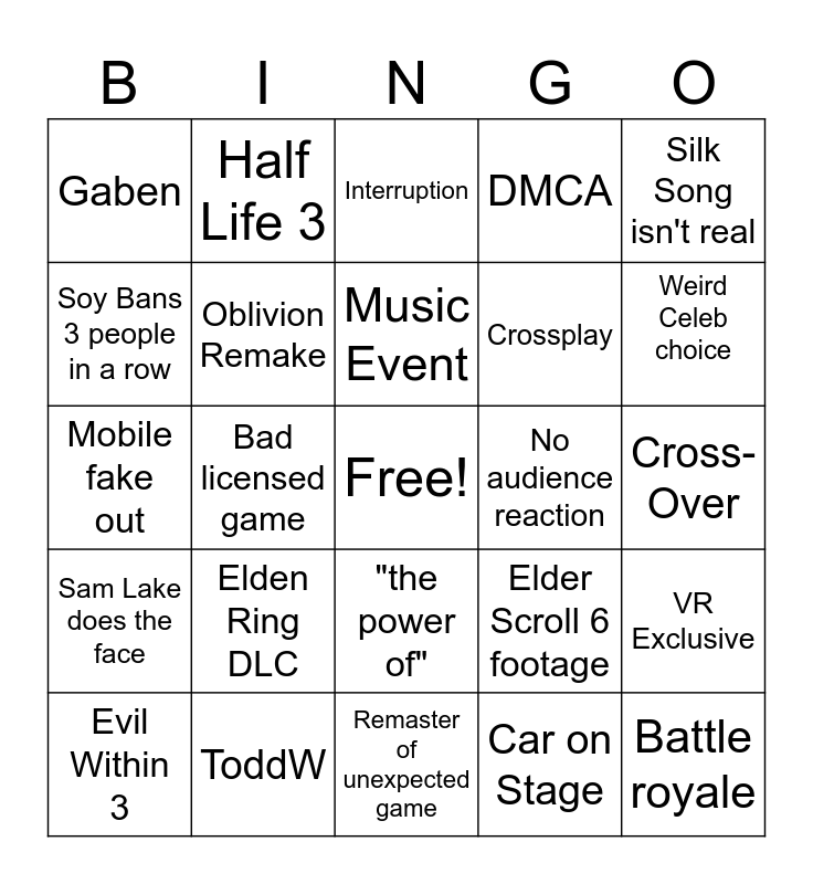 This bingo card has a free space and 24 words: Evil Within 3, Elden Ring DLC, Music Event, Car on Stage, Silk Song isn't real, Gaben, Half Life 3, Interruption, No audience reaction, Cross-Over, Mobile fake out, Oblivion Remake, Elder Scroll 6 footage, VR Exclusive, Soy Bans 3 people in a row, ToddW, Remaster of unexpected game, DMCA, Weird Celeb choice, Sam Lake does the face, Bad licensed game, "the power of", Crossplay and Battle royale.