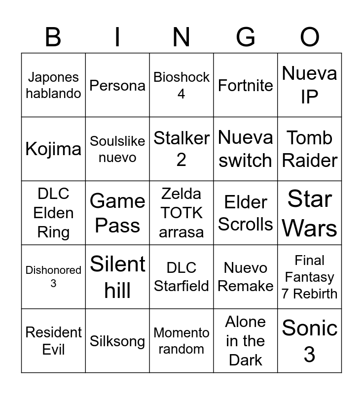 This bingo card has a free space and 24 words: Silent hill, Silksong, Stalker 2, Resident Evil, Nueva IP, Japones hablando, Kojima, Persona, Elder Scrolls, DLC Starfield, Nueva switch, DLC Elden Ring, Nuevo Remake, Final Fantasy 7 Rebirth, Soulslike nuevo, Alone in the Dark, Star Wars, Bioshock 4, Tomb Raider, Game Pass, Sonic 3, Dishonored 3, Fortnite and Momento random.
