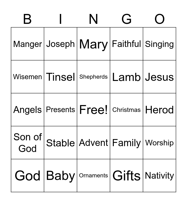 This bingo card has a free space and 36 words: Celebration, Jerusalem, Lights, Tinsel, Family, Son of God, Shepherds, Carols, Singing, Christmas Tree, Presents, Faithful, Bethlehem, Christmas, Jesus, Manger, Silent Night, Stable, Nativity, Mary, Herod, Worship, Baby, God, Ornaments, Joseph, Angels, Ceaser Augustus, Lamb, Wisemen, Star, Stockings, Gifts, Advent, Traditions and Christmas Eve.