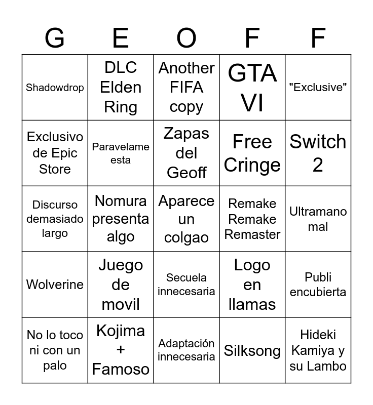 This bingo card has a free space and 24 words: Juego de movil, Kojima + Famoso, Zapas del Geoff, No lo toco ni con un palo, "Exclusive", Shadowdrop, Exclusivo de Epic Store, DLC Elden Ring, Remake Remake Remaster, Secuela innecesaria, Free Cringe, Discurso demasiado largo, Logo en llamas, Publi encubierta, Paravelame esta, Silksong, Ultramano mal, Another FIFA copy, Switch 2, Nomura presenta algo, Hideki Kamiya y su Lambo, Wolverine, GTA VI and Adaptación innecesaria.