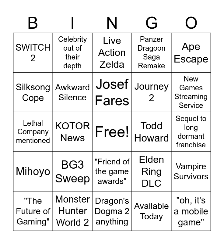 This bingo card has a free space and 24 words: BG3 Sweep, Monster Hunter World 2, Josef Fares, "The Future of Gaming", Ape Escape, SWITCH 2, Silksong Cope, Celebrity out of their depth, Todd Howard, "Friend of the game awards", Journey 2, Lethal Company mentioned, Elden Ring DLC, Vampire Survivors, Awkward Silence, Available Today, Sequel to long dormant franchise, Live Action Zelda, New Games Streaming Service, KOTOR News, "oh, it's a mobile game", Mihoyo, Panzer Dragoon Saga Remake and Dragon's Dogma 2 anything.