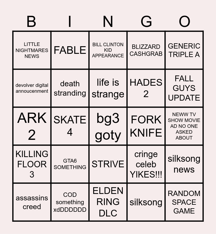 This bingo card has a free space and 24 words: GTA6 SOMETHING, COD something xdDDDDDD, life is strange, assassins creed, GENERIC TRIPLE A, LITTLE NIGHTMARES NEWS, devolver digital annoucenment, FABLE, FORK KNIFE, STRIVE, HADES 2, ARK 2, cringe celeb YIKES!!!, silksong news, death stranding, silksong, NEWW TV SHOW MOVIE AD NO ONE ASKED ABOUT, BILL CLINTON KID APPEARANCE, FALL GUYS UPDATE, SKATE 4, RANDOM SPACE GAME, KILLING FLOOR 3, BLIZZARD CASHGRAB and ELDEN RING DLC.