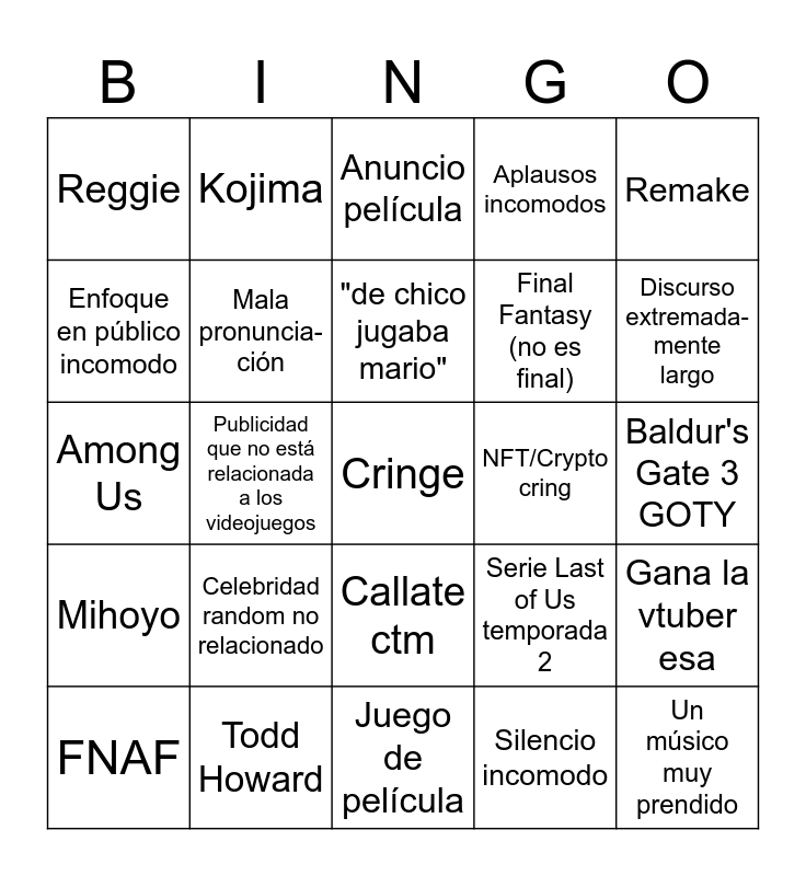 This bingo card has a free space and 24 words: Celebridad random no relacionado, Todd Howard, "de chico jugaba mario", FNAF, Remake, Reggie, Enfoque en público incomodo, Kojima, NFT/Crypto cring, Callate ctm, Final Fantasy (no es final), Among Us, Serie Last of Us temporada 2, Gana la vtuber esa, Mala pronuncia- ción, Silencio incomodo, Baldur's Gate 3 GOTY, Anuncio película, Discurso extremada-mente largo, Publicidad que no está relacionada a los videojuegos, Un músico muy prendido, Mihoyo, Aplausos incomodos and Juego de película.