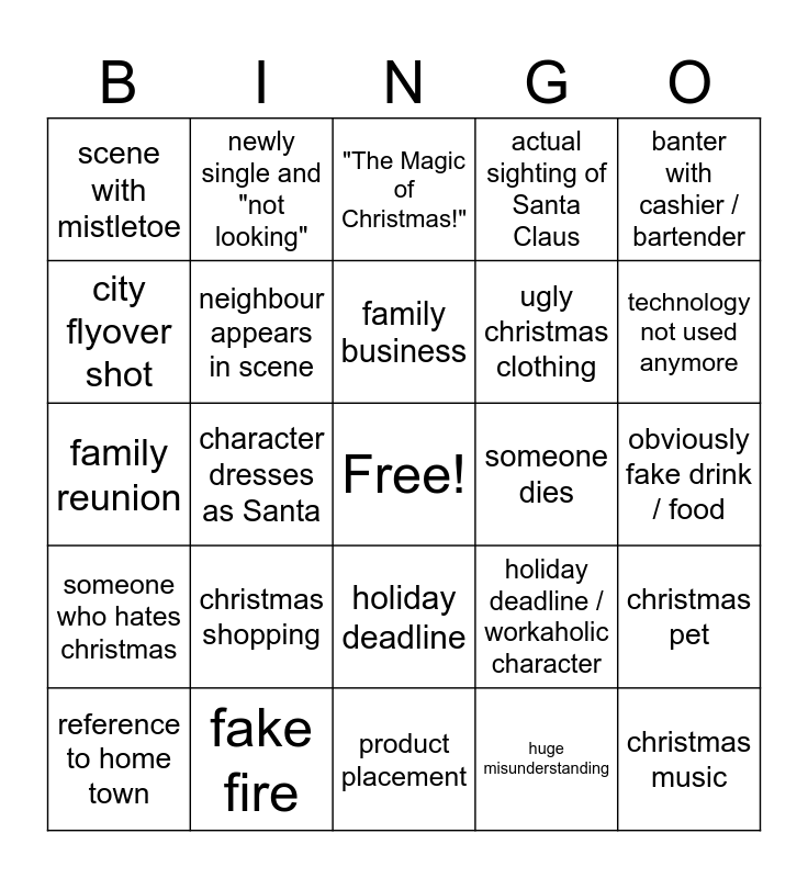This bingo card has a free space and 29 words: reference to home town, montage scene, character dresses as Santa, struggling relationship, scene with mistletoe, "The Magic of Christmas!", neighbour appears in scene, christmas shopping, someone dies, fake fire, obviously fake drink / food, christmas music, product placement, huge misunderstanding, technology not used anymore, christmas tree catastrophe, holiday deadline, someone who hates christmas, banter with cashier / bartender, family reunion, holiday deadline / workaholic character, it snows / wild weather, ugly christmas clothing, city flyover shot, actual sighting of Santa Claus, newly single and "not looking", christmas pet, family business and CG5 effects.