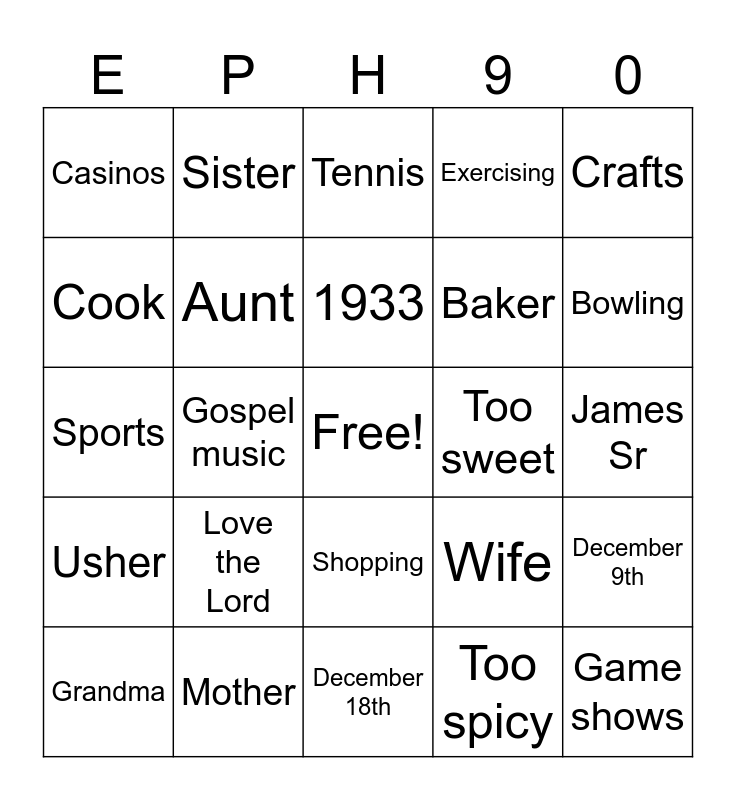 This bingo card has a free space and 25 words: Love the Lord, December 18th, 1933, Grandma, Crafts, Casinos, Cook, Sister, Too sweet, Shopping, Baker, Sports, Wife, December 9th, Aunt, Sewing, James Sr, Tennis, Bowling, Gospel music, Game shows, Mother, Usher, Exercising and Too spicy.
