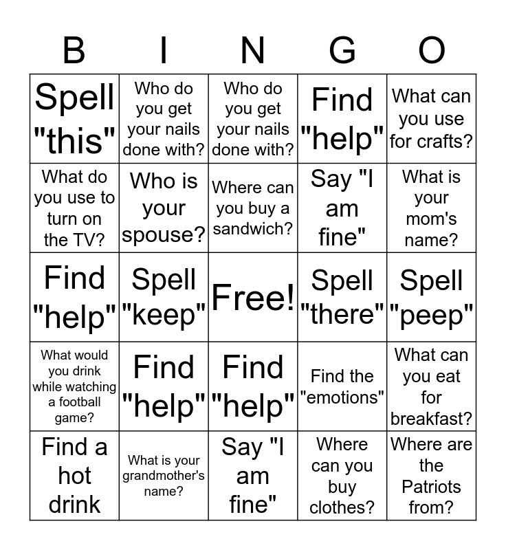 This bingo card has a free space and 24 words: Find "help", What is your grandmother's name?, Where can you buy a sandwich?, Find a hot drink, What can you use for crafts?, Spell "this", What do you use to turn on the TV?, Who do you get your nails done with?, Spell "there", Find "help", Say "I am fine", Find "help", Find the "emotions", What can you eat for breakfast?, Who is your spouse?, Where can you buy clothes?, Spell "peep", Who do you get your nails done with?, What is your mom's name?, Spell "keep", Where are the Patriots from?, What would you drink while watching a football game?, Find "help" and Say "I am fine".