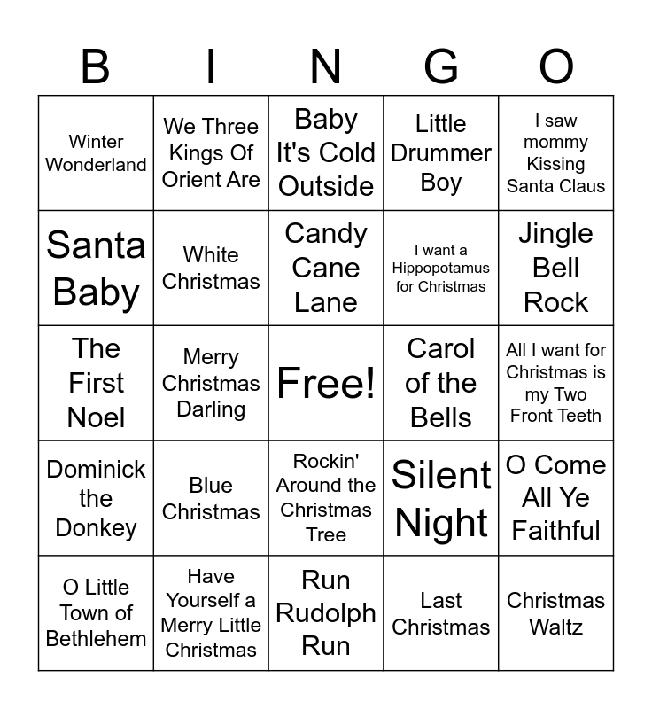 This bingo card has a free space and 29 words: O Little Town of Bethlehem, Rudolph the Red Nosed Reindeer, Merry Christmas Darling, Jolly Old St. Nicholas, Winter Wonderland, Baby It's Cold Outside, White Christmas, Blue Christmas, Carol of the Bells, Have Yourself a Merry Little Christmas, All I want for Christmas is my Two Front Teeth, Christmas Waltz, Run Rudolph Run, Last Christmas, Jingle Bell Rock, Grandma Got Run Over by a Reindeer, Rockin' Around the Christmas Tree, Dominick the Donkey, I saw mommy Kissing Santa Claus, The First Noel, Silent Night, Joy to the World, I want a Hippopotamus for Christmas, Santa Baby, Little Drummer Boy, We Three Kings Of Orient Are, O Come All Ye Faithful, Candy Cane Lane and Go Tell it on the Mountain.