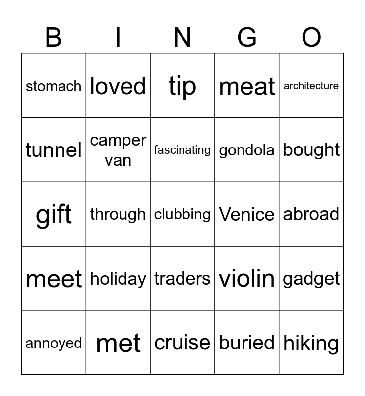 This bingo card has 25 words: holiday, cruise, fascinating, annoyed, architecture, stomach, tunnel, loved, Venice, traders, gondola, gift, violin, gadget, camper van, hiking, abroad, tip, bought, through, clubbing, met, meet, meat and buried.