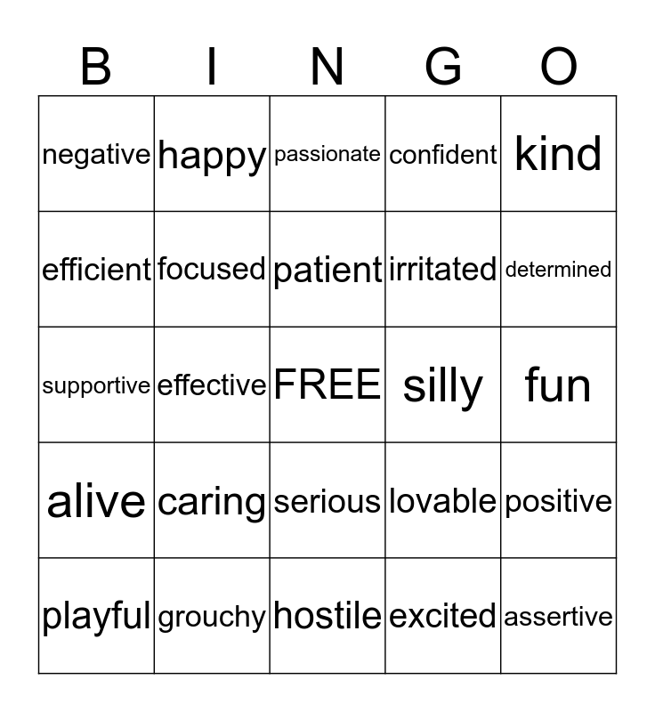 This bingo card has a free space and 24 words: caring, grouchy, patient, playful, kind, negative, efficient, happy, silly, serious, irritated, supportive, lovable, positive, focused, excited, fun, passionate, determined, effective, assertive, alive, confident and hostile.