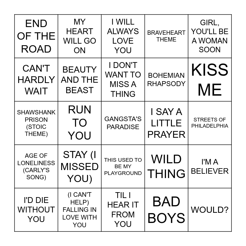 This bingo card has 59 words: (EVERYTHING I DO) I DO IT FOR YOU, (I CAN'T HELP) FALLING IN LOVE WITH YOU, A WHOLE NEW WORLD, AGE OF LONELINESS (CARLY'S SONG), BAD BOYS, BALLROOM BLITZ, BEAUTY AND THE BEAST, BLAZE OF GLORY, BOHEMIAN RHAPSODY, BORN SLIPPY, BRAVEHEART THEME, BUILD ME UP BUTTERCUP, CAN'T HARDLY WAIT, CIRCLE OF LIFE, JURASSIC PARK, END OF THE ROAD, GANGSTA'S PARADISE, GIRL, YOU'LL BE A WOMAN SOON, GLADIATOR MAIN THEME, I DON'T WANT TO MISS A THING, I SAY A LITTLE PRAYER, I WILL ALWAYS LOVE YOU, I'D DIE WITHOUT YOU, I'M A BELIEVER, IN THE WEE SMALL HOURS OF THE MORNING, IT HAD TO BE YOU, IT MUST HAVE BEEN LOVE, KISS FROM A ROSE, KISS ME, LOVE IS ALL AROUND, LOVEFOOL, MEN IN BLACK, MISERLOU, MISSION IMPOSSIBLE-MAIN THEME, MY HEART WILL GO ON, OH, PRETTY WOMAN, ONLY YOU, RUN TO YOU, SECRET GARDEN, SHAWSHANK PRISON (STOIC THEME), SHE, STAY (I MISSED YOU), STREETS OF PHILADELPHIA, STUCK IN THE MIDDLE WITH YOU, SUPERMODEL, THAT THING YOU DO!, THE ADDAMS FAMILY THEME, THE SHOOP SHOOP SONG (IT'S IN HIS KISS), THIS USED TO BE MY PLAYGROUND, TIL I HEAR IT FROM YOU, TOM'S DINER, UNCHAINED MELODY, WHAT IS LOVE, WHERE IS MY MIND, WICKED GAME, WILD THING, WILD WILD WEST, WOULD? and YOU COULD BE MINE.