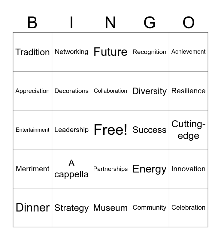 This bingo card has a free space and 50 words: ExxonMobil, Celebration, Technology, Museum, A cappella, Festive, Networking, Teamwork, Appreciation, Holidays, Decorations, Recognition, Innovation, Energy, Global, Sustainability, Collaboration, Success, Growth, Achievement, Leadership, Community, Tradition, Diversity, Inclusion, Excellence, Resilience, Creativity, Future, Partnerships, Values, Dedication, Professionalism, Vision, Strategy, Philanthropy, Culture, Industry, Research, Cutting-edge, Adaptability, Customer, Market, Ethical, Dinner, Entertainment, Engagement, Gratitude, Merriment and Cheer.
