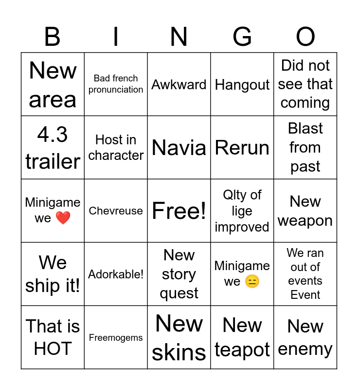 This bingo card has a free space and 24 words: Adorkable!, Freemogems, Navia, That is HOT, Did not see that coming, New area, 4.3 trailer, Bad french pronunciation, Qlty of lige improved, New story quest, Rerun, Minigame we ❤️, Minigame we 😑, We ran out of events Event, Host in character, New teapot, New weapon, Awkward, Blast from past, Chevreuse, New enemy, We ship it!, Hangout and New skins.