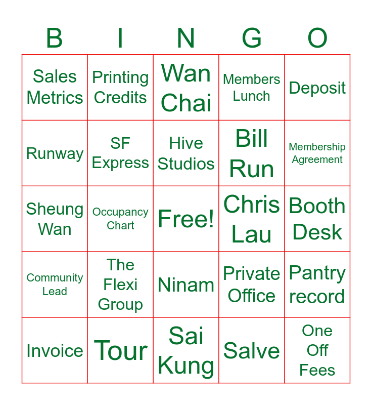 This bingo card has a free space and 29 words: Invoice, Phone Booth, Occupancy Chart, Meeting Room, Sales Metrics, Wan Chai, SF Express, The Flexi Group, Chris Lau, Tour, Booth Desk, One Off Fees, Sai Kung, Salve, Membership Agreement, Invoice, Ninam, Community Lead, Deposit, Sheung Wan, Private Office, Part time Hotdesk, Bill Run, Runway, Members Lunch, Printing Credits, Pantry record, Hive Studios and Emma Day.