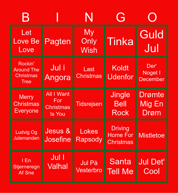 This bingo card has a free space and 24 words: I En Stjerneregn Af Sne, Jesus & Josefine, Last Christmas, Santa Tell Me, Guld Jul, Let Love Be Love, Pagten, My Only Wish, Jingle Bell Rock, Drømte Mig En Drøm, Merry Christmas Everyone, Jul i Angora, Driving Home For Christmas, Mistletoe, Rockin' Around The Christmas Tree, Jul I Valhal, Jul På Vesterbro, Tinka, Der' Noget I December, Ludvig Og Julemanden, All I Want For Christmas Is You, Lokes Rapsody, Koldt Udenfor and Jul Det' Cool.