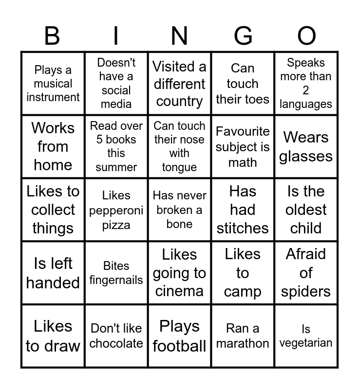 This bingo card has 25 words: Is left handed, Don't like chocolate, Has never broken a bone, Ran a marathon, Speaks more than 2 languages, Plays a musical instrument, Doesn't have a social media, Visited a different country, Has had stitches, Afraid of spiders, Works from home, Read over 5 books this summer, Plays football, Likes to camp, Wears glasses, Likes to draw, Likes pepperoni pizza, Can touch their nose with tongue, Favourite subject is math, Is the oldest child, Likes to collect things, Bites fingernails, Likes going to cinema, Can touch their toes and Is vegetarian.
