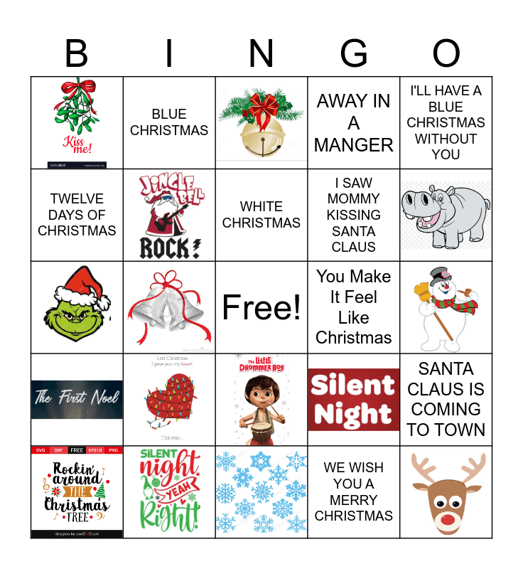 This bingo card has 16 images, a free space and 13 words: Santa Tell Me, All I want For Christmas Is You, You Make It Feel Like Christmas, WE WISH YOU A MERRY CHRISTMAS, BABY IT'S COLD OUTSIDE, I'LL HAVE A BLUE CHRISTMAS WITHOUT YOU, I SAW MOMMY KISSING SANTA CLAUS, TWELVE DAYS OF CHRISTMAS, AWAY IN A MANGER, BLUE CHRISTMAS, SANTA CLAUS IS COMING TO TOWN, WHITE CHRISTMAS and IT'S THE MOST WONDERFUL TIME OF THE YEAR.
