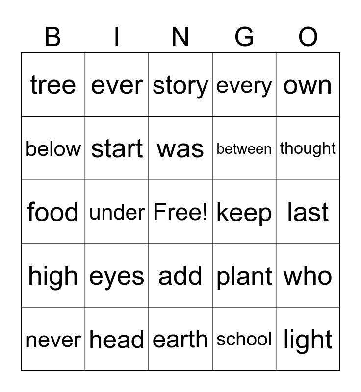 This bingo card has a free space and 29 words: never, father, under, city, tree, story, start, eyes, keep, head, last, light, earth, school, thought, near, add, high, own, food, plant, country, between, below, every, ever, who, was and there.
