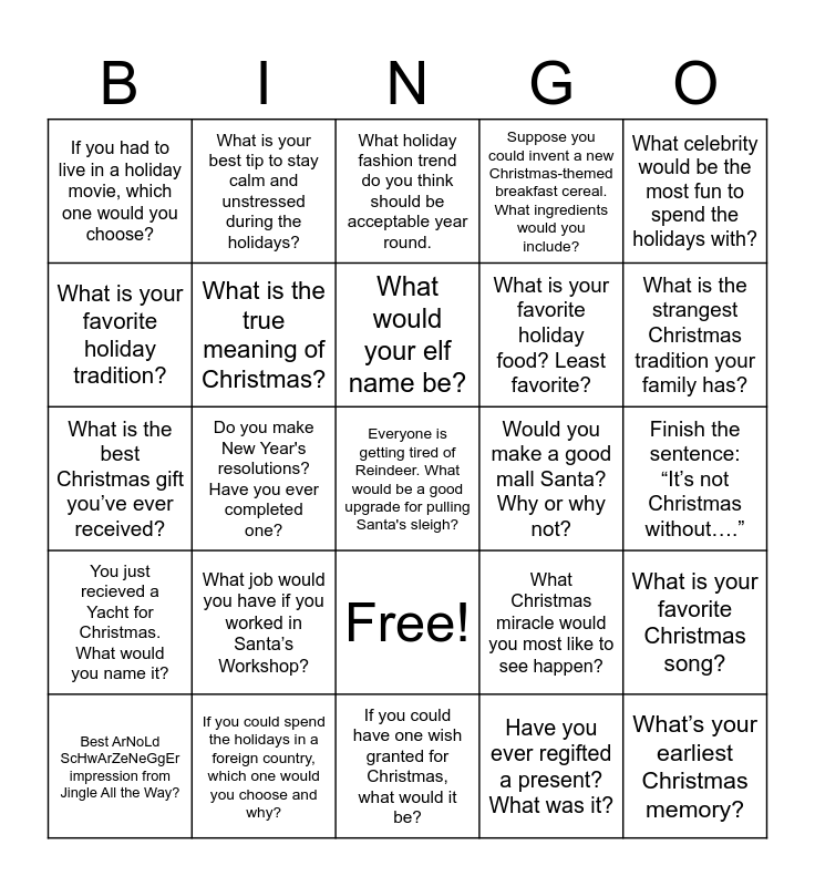 This bingo card has 26 words: Free!, Have you ever regifted a present? What was it?, What would your elf name be?, If you could spend the holidays in a foreign country, which one would you choose and why?, What celebrity would be the most fun to spend the holidays with?, If you had to live in a holiday movie, which one would you choose?, What is your favorite holiday tradition?, What is your best tip to stay calm and unstressed during the holidays?, Finish the sentence: “It’s not Christmas without….”, What Christmas miracle would you most like to see happen?, What is your favorite holiday food? Least favorite?, What is the best Christmas gift you’ve ever received?, What is your favorite Christmas song?, Best ArNoLd ScHwArZeNeGgEr impression from Jingle All the Way?, Do you make New Year's resolutions? Have you ever completed one?, Have you ever opened a holiday gift before you were supposed to as a child?, Suppose you could invent a new Christmas-themed breakfast cereal. What ingredients would you include?, You just recieved a Yacht for Christmas. What would you name it?, What holiday fashion trend do you think should be acceptable year round., Everyone is getting tired of Reindeer. What would be a good upgrade for pulling Santa's sleigh?, What is the strangest Christmas tradition your family has?, If you could have one wish granted for Christmas, what would it be?, Would you make a good mall Santa? Why or why not?, What job would you have if you worked in Santa’s Workshop?, What is the true meaning of Christmas? and What’s your earliest Christmas memory?.
