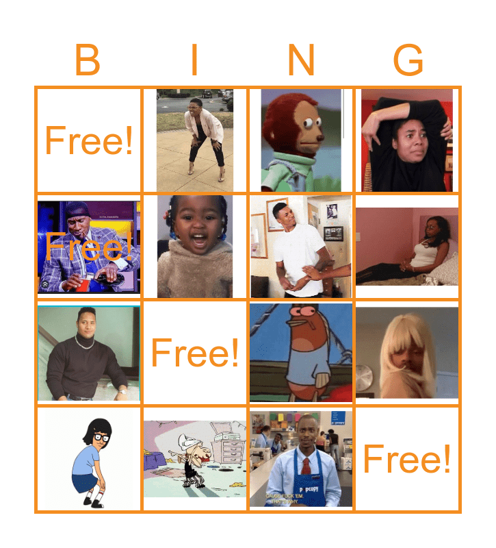 This bingo card has 13 images and 4 words: Free!, Free!, Free! and Free!.