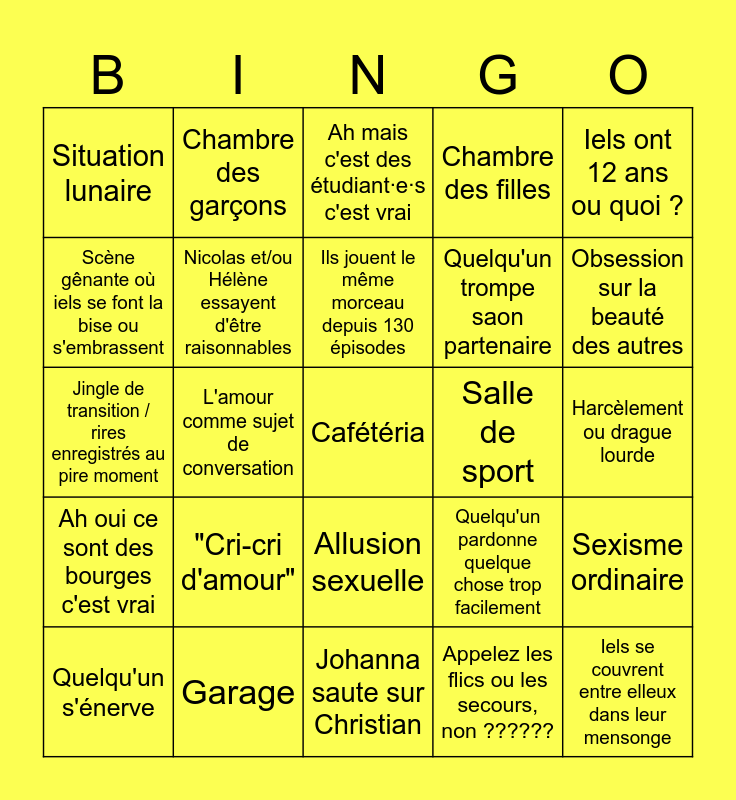 This bingo card has a free space and 24 words: Quelqu'un s'énerve, "Cri-cri d'amour", Ils jouent le même morceau depuis 130 épisodes, Appelez les flics ou les secours, non ??????, Iels ont 12 ans ou quoi ?, Situation lunaire, Chambre des garçons, Ah mais c'est des étudiant·e·s c'est vrai, Salle de sport, Harcèlement ou drague lourde, Jingle de transition / rires enregistrés au pire moment, Nicolas et/ou Hélène essayent d'être raisonnables, Quelqu'un pardonne quelque chose trop facilement, Sexisme ordinaire, Scène gênante où iels se font la bise ou s'embrassent, Garage, Johanna saute sur Christian, Chambre des filles, Obsession sur la beauté des autres, Ah oui ce sont des bourges c'est vrai, L'amour comme sujet de conversation, Allusion sexuelle, Quelqu'un trompe saon partenaire and Iels se couvrent entre elleux dans leur mensonge.