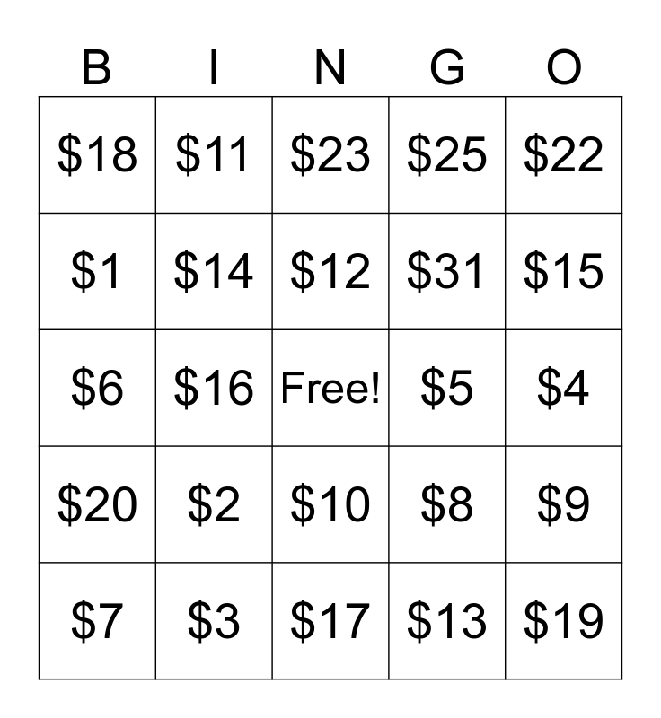 This bingo card has a free space and 24 words: $2, $3, $12, $7, $22, $18, $1, $11, $5, $10, $31, $6, $8, $9, $14, $13, $4, $23, $15, $16, $19, $20, $25 and $17.
