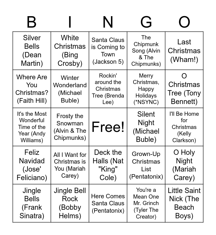 This bingo card has a free space and 27 words: Grown-Up Christmas List (Pentatonix), It's Beginning to Look a Lot like Christmas (Michael Buble), Merry Christmas, Happy Holidays (*NSYNC), Here Comes Santa Claus (Pentatonix), Where Are You Christmas? (Faith Hill), Santa Claus is Coming to Town (Jackson 5), White Christmas (Bing Crosby), Feliz Navidad (Jose' Feliciano), Silent Night (Michael Buble), O Holy Night (Mariah Carey), It's the Most Wonderful Time of the Year (Andy Williams), The Chipmunk Song (Alvin & The Chipmunks), Jingle Bells (Frank Sinatra), Jingle Bell Rock (Bobby Helms), O Christmas Tree (Tony Bennett), Do You Hear What I Hear? (Andy Williams), Winter Wonderland (Michael Buble), Rockin' around the Christmas Tree (Brenda Lee), All I Want for Christmas is You (Mariah Carey), Silver Bells (Dean Martin), I'll Be Home for Christmas (Kelly Clarkson), You're a Mean One Mr. Grinch (Tyler The Creator), Frosty the Snowman (Alvin & The Chipmunks), Little Saint Nick (The Beach Boys), Deck the Halls (Nat "King" Cole), Last Christmas (Wham!) and Let It Snow! Let It Snow! Let It Snow! (Dean Martin).