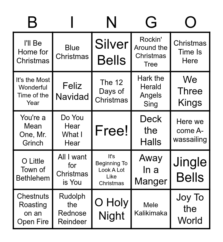 This bingo card has a free space and 35 words: Jingle Bell Rock, White Christmas, The Little Drummer Boy, Feliz Navidad, It's Beginning To Look A Lot Like Christmas, Rockin' Around the Christmas Tree, It's the Most Wonderful Time of the Year, White Christmas, The 12 Days of Christmas, Silent Night, You're a Mean One, Mr. Grinch, Christmas Time Is Here, The First Noel, Have yourself a Merry Little Christmas, I'll Be Home for Christmas, Deck the Halls, Mele Kalikimaka, Do You Hear What I Hear, O Little Town of Bethlehem, Joy To the World, Away In a Manger, Chestnuts Roasting on an Open Fire, Jingle Bells, Rudolph the Rednose Reindeer, Silver Bells, We Three Kings, Carol Of the Bells, God Rest You Merry Gentlemen, Hark the Herald Angels Sing, Here we come A-wassailing, O Come All Ye Faithful, O Holy Night, All I want for Christmas is You, Blue Christmas and Chipmunk Christmas Song.