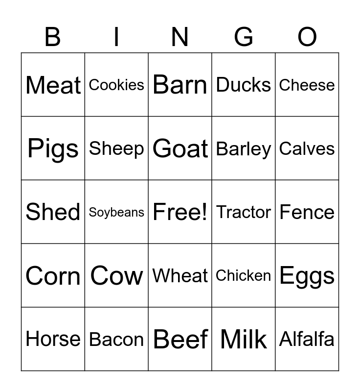 This bingo card has a free space and 24 words: Horse, Cow, Goat, Milk, Cheese, Meat, Cookies, Barn, Tractor, Fence, Shed, Sheep, Chicken, Eggs, Pigs, Bacon, Beef, Ducks, Calves, Corn, Soybeans, Wheat, Barley and Alfalfa.