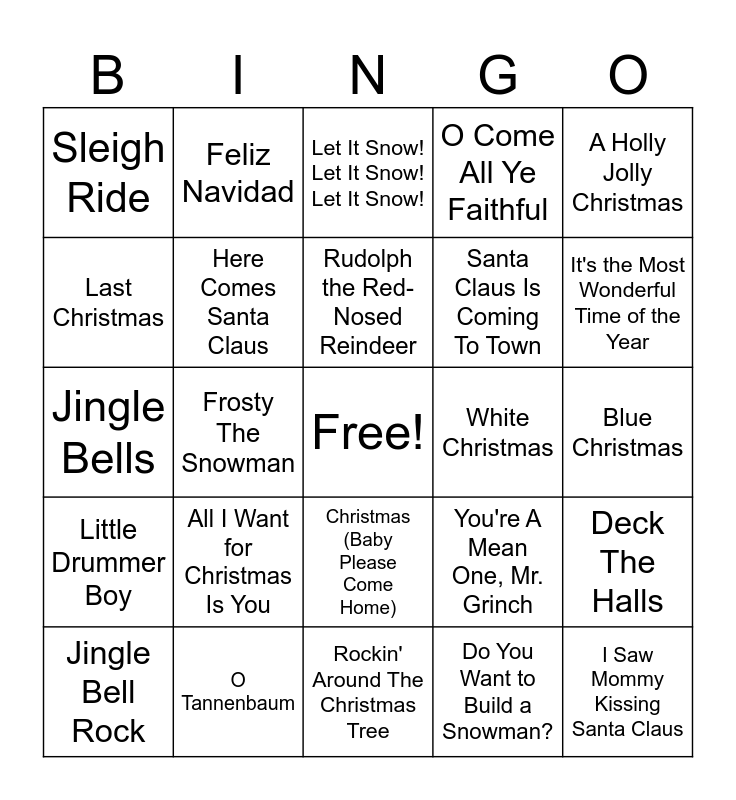 This bingo card has a free space and 25 words: All I Want for Christmas Is You, Rockin' Around The Christmas Tree, Rudolph the Red-Nosed Reindeer, Jingle Bell Rock, A Holly Jolly Christmas, Sleigh Ride, Last Christmas, Feliz Navidad, White Christmas, Christmas (Baby Please Come Home), Santa Claus Is Coming To Town, Jingle Bells, You're A Mean One, Mr. Grinch, Deck The Halls, Here Comes Santa Claus, It's Beginning to Look a Lot like Christmas, Blue Christmas, Let It Snow! Let It Snow! Let It Snow!, It's the Most Wonderful Time of the Year, Frosty The Snowman, I Saw Mommy Kissing Santa Claus, O Tannenbaum, Little Drummer Boy, O Come All Ye Faithful and Do You Want to Build a Snowman?.