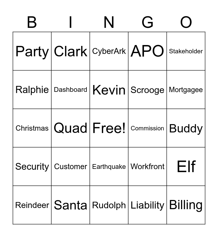 This bingo card has a free space and 36 words: Claim, Hadoop, Actuarial, Dashboard, Workfront, Security, Kevin, Profitability, Stakeholder, Exstream, Quad, APO, Acuity, Commission, Mortgagee, Party, Enterprise, Customer, Billing, CyberArk, Buddy, Elf, Santa, Reindeer, Rudolph, Clark, Christmas, Grinch, Scrooge, Ralphie, Jingle, Blanket, Liability, Earthquake, Mike Kemp and Brandon Gigot.