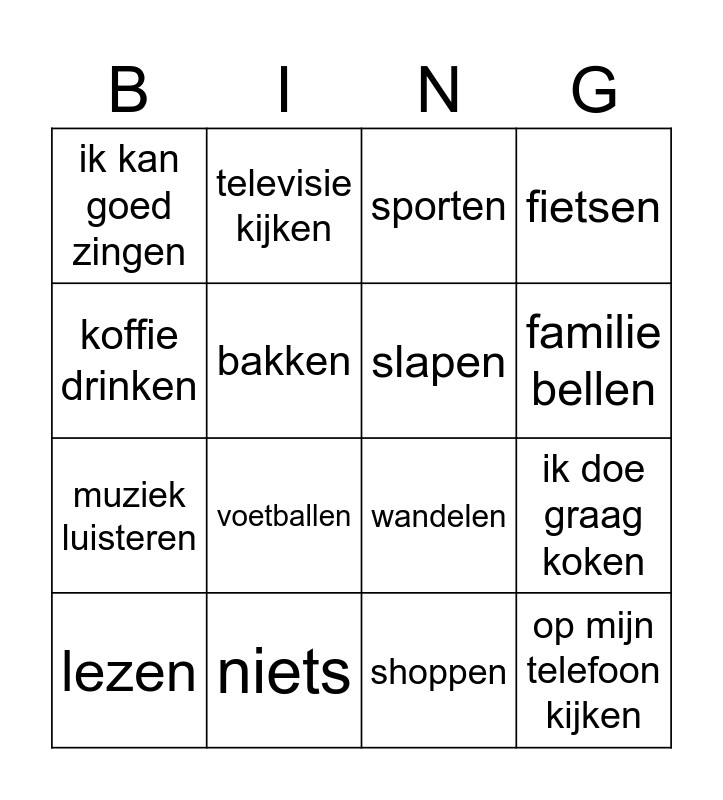 This bingo card has 16 words: niets, ik doe graag koken, sporten, ik kan goed zingen, muziek luisteren, televisie kijken, wandelen, shoppen, koffie drinken, bakken, lezen, fietsen, voetballen, familie bellen, slapen and op mijn telefoon kijken.