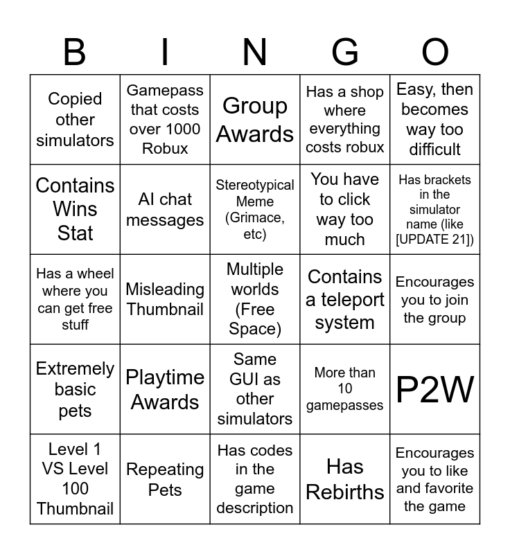 This bingo card has a free space and 24 words: Playtime Awards, Repeating Pets, Stereotypical Meme (Grimace, etc), Level 1 VS Level 100 Thumbnail, Easy, then becomes way too difficult, Copied other simulators, Contains Wins Stat, Gamepass that costs over 1000 Robux, Contains a teleport system, Same GUI as other simulators, You have to click way too much, Has a wheel where you can get free stuff, More than 10 gamepasses, P2W, AI chat messages, Has Rebirths, Encourages you to join the group, Group Awards, Has brackets in the simulator name (like [UPDATE 21]), Misleading Thumbnail, Encourages you to like and favorite the game, Extremely basic pets, Has a shop where everything costs robux and Has codes in the game description.