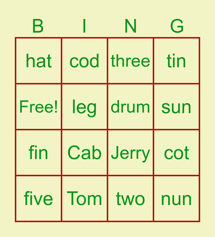 This bingo card has 16 words: Tom, cot, three, hat, fin, cod, Jerry, two, Free!, leg, five, tin, Cab, sun, drum and nun.