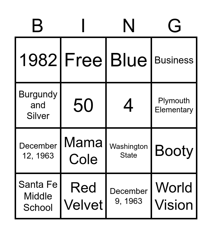This bingo card has 20 words: Booty, Cosmetology, Blue, Cinnabon, Santa Fe Middle School, Burgundy and Silver, Red Velvet, 1982, December 12, 1963, Free, Mama Cole, Washington State, 50, World Vision, 4, Wildrose, Plymouth Elementary, Business, December 9, 1963 and Washington DC.