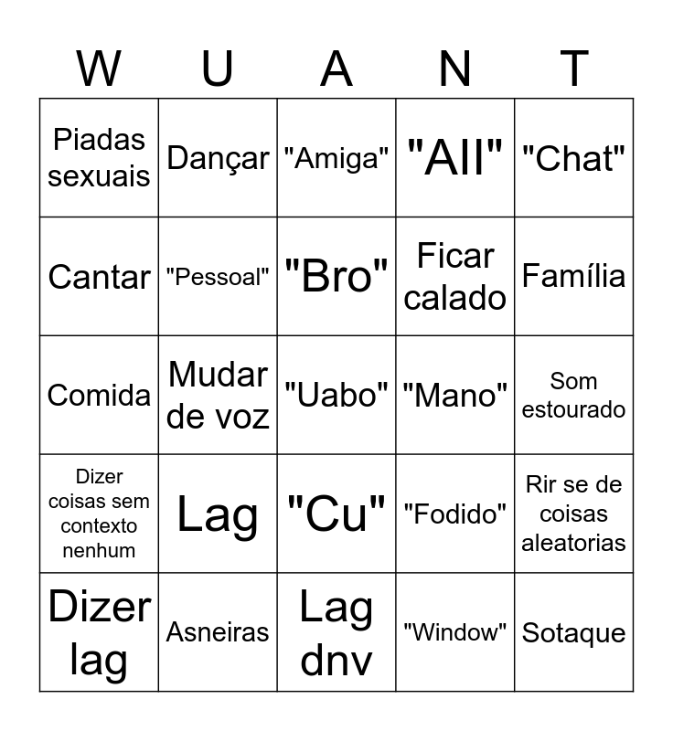 This bingo card has a free space and 24 words: Lag, Asneiras, "Bro", Dizer lag, "Chat", Piadas sexuais, Cantar, Dançar, "Mano", "Cu", Ficar calado, Comida, "Fodido", Rir se de coisas aleatorias, "Pessoal", "Window", Som estourado, "Amiga", Família, Mudar de voz, Sotaque, Dizer coisas sem contexto nenhum, "AII" and Lag dnv.