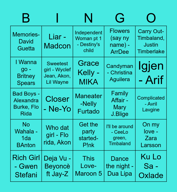This bingo card has a free space and 24 words: Who dat girl - Flo rida, Akon, Deja Vu - Beyoncè ft Jay-Z, Grace Kelly -MIKA, Rich Girl - Gwen Stefani, Carry Out- Timbaland, Justin Timberlake, Memories- David Guetta, I Wanna go - Britney Spears, Liar - Madcon, Family Affair - Mary J.Blige, Get the party started- P!nk, Candyman - Christina Aguilera, Bad Boys - Alexandra Burke, Flo Rida, I'll be around - CeeLo green, Timbaland, On my love - Zara Larsson, Sweetest girl - Wyclef Jean, Akon, Lil Wayne, Dance the night - Dua Lipa, Complicated - Avril Lavgine, Independent Woman pt 1 - Destiny's child, Igjen - Arif, Closer - Ne-Yo, Ku Lo Sa -Oxlade, No Wahala - 1da BAnton, Flowers (say ny name) - ArrDee and This Love- Maroon 5.