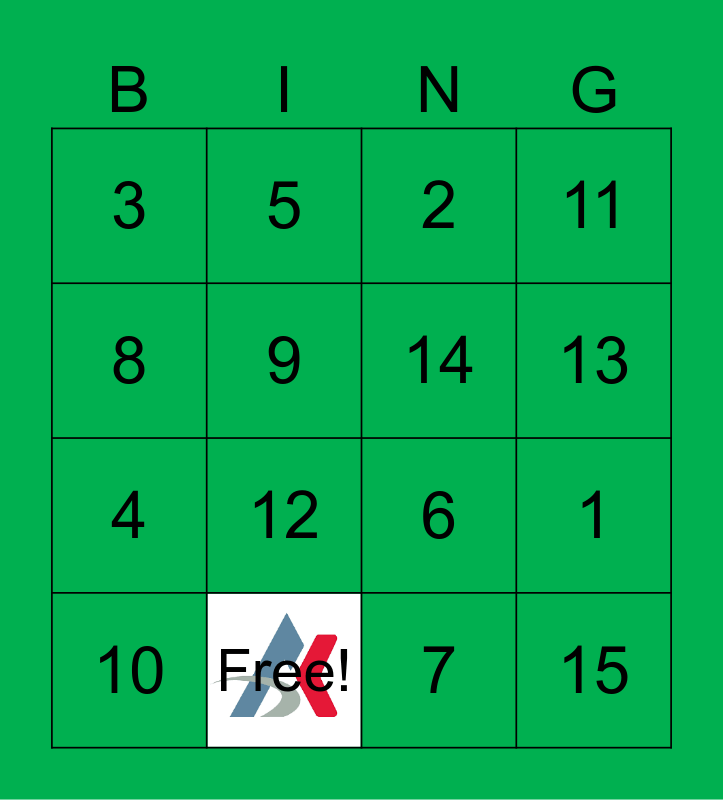 This bingo card has 1 images and 16 words: Free!, 1, 2, 3, 4, 5, 6, 7, 8, 9, 10, 11, 12, 13, 14 and 15.
