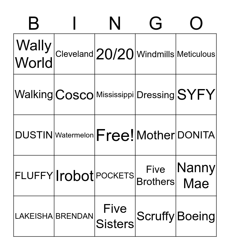 This bingo card has a free space and 50 words: Linville, Boeing, Pockets, Five Sisters, Irobot, Two Sisters, Cleveland, Aunt Dorothy, Walking, Two Brothers, Cosco, Windmills, Nanny Mae, Five Brothers, Five Sisters, Ada Mae, Mississippi, Mother, Tennessee, Meticulous, Watermelon, Scruffy, Wally World, Dressing, AUDI, BMW, SYFY, DATELINE, 20/20, POCKETS, AT&T, WILLIAM, VALERIE, TRISTAN, BRENDAN, DEMETRUS, ANTHONY, QUINO, KIMBERLY, DONITA, ADA, TRAYVON, JULIAN, GIANNI, LAKEISHA, DUSTIN, MICHELLE, LYIA, FLUFFY and CODY.