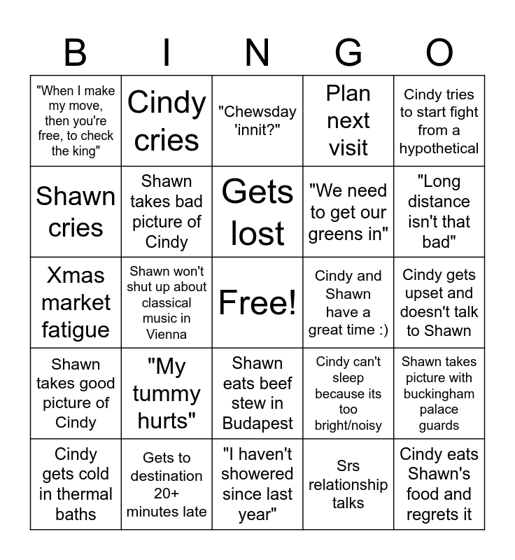 This bingo card has a free space and 24 words: "My tummy hurts", Gets to destination 20+ minutes late, Gets lost, Cindy gets cold in thermal baths, Cindy tries to start fight from a hypothetical, "When I make my move, then you're free, to check the king", Shawn cries, Cindy cries, Cindy and Shawn have a great time :), Shawn eats beef stew in Budapest, "We need to get our greens in", Xmas market fatigue, Cindy can't sleep because its too bright/noisy, Shawn takes picture with buckingham palace guards, Shawn takes bad picture of Cindy, Srs relationship talks, Cindy gets upset and doesn't talk to Shawn, "Chewsday 'innit?", "Long distance isn't that bad", Shawn won't shut up about classical music in Vienna, Cindy eats Shawn's food and regrets it, Shawn takes good picture of Cindy, Plan next visit and "I haven't showered since last year".
