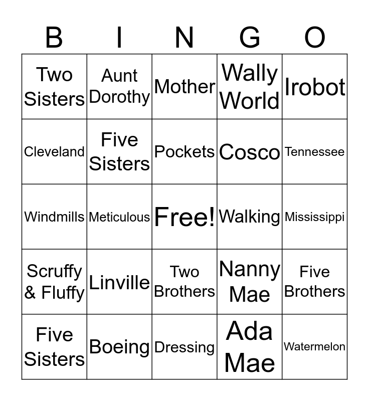 This bingo card has a free space and 24 words: Linville, Boeing, Pockets, Five Sisters, Irobot, Two Sisters, Cleveland, Aunt Dorothy, Walking, Two Brothers, Cosco, Windmills, Nanny Mae, Five Brothers, Five Sisters, Ada Mae, Mississippi, Mother, Tennessee, Meticulous, Watermelon, Scruffy & Fluffy, Wally World and Dressing.
