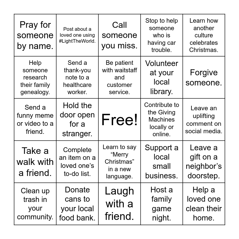 This bingo card has a free space and 50 words: Let someone else be kind to you., Help a loved one clean their home., Apologize to someone., Laugh with a friend., Complete an item on a loved one’s to-do list., Ask a coworker how you can lighten their load., Post about a loved one using #LightTheWorld., Share a link to a holiday song that you love., Help someone research their family genealogy., Make a Christmas playlist and share it with a friend., Send a thank-you note to a healthcare worker., Stop to help someone who is having car trouble., Leave a gift on a neighbor’s doorstep., Support a local small business., Give your neighbor a compliment., Let a stranger go ahead of you in line., Be patient with waitstaff and customer service., Contribute to the Giving Machines locally or online., Text a photo of a fond memory to a family member., Learn how another culture celebrates Christmas., Hold the door open for a stranger., Host a family game night., Pray for someone by name., Volunteer at your local library., Pay for the person behind you at the store., Give a hug to a friend., Forgive someone., Invite others to a Christmas celebration., Call someone you miss., Learn to say “Merry Christmas” in a new language., Carry an extra snack for someone in need., Send a homemade Christmas card to a friend., Plan some one-on-one time with a loved one., Give your favorite book to a loved one., Donate cans to your local food bank., Smile at someone., Leave a kind note for your mail carrier., Invite a neighbor to a worship service., Watch The Christ Child with family or friends., Leave an uplifting comment on social media., Visit with an elderly neighbor., Text someone, “I'm grateful for you.”, Tell a loved one they matter to you., Be kind to yourself. Practice self-care., Clean up trash in your community., Send a funny meme or video to a friend., Make a meal with a family member., Go caroling with a group., Take a walk with a friend. and Offer to teach someone a new skill..