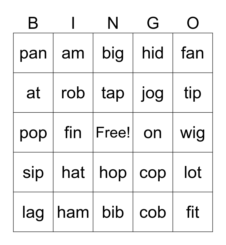 This bingo card has a free space and 24 words: hat, ham, tap, lag, fan, pan, at, am, on, hop, jog, pop, cop, lot, rob, cob, wig, big, tip, fin, fit, sip, hid and bib.
